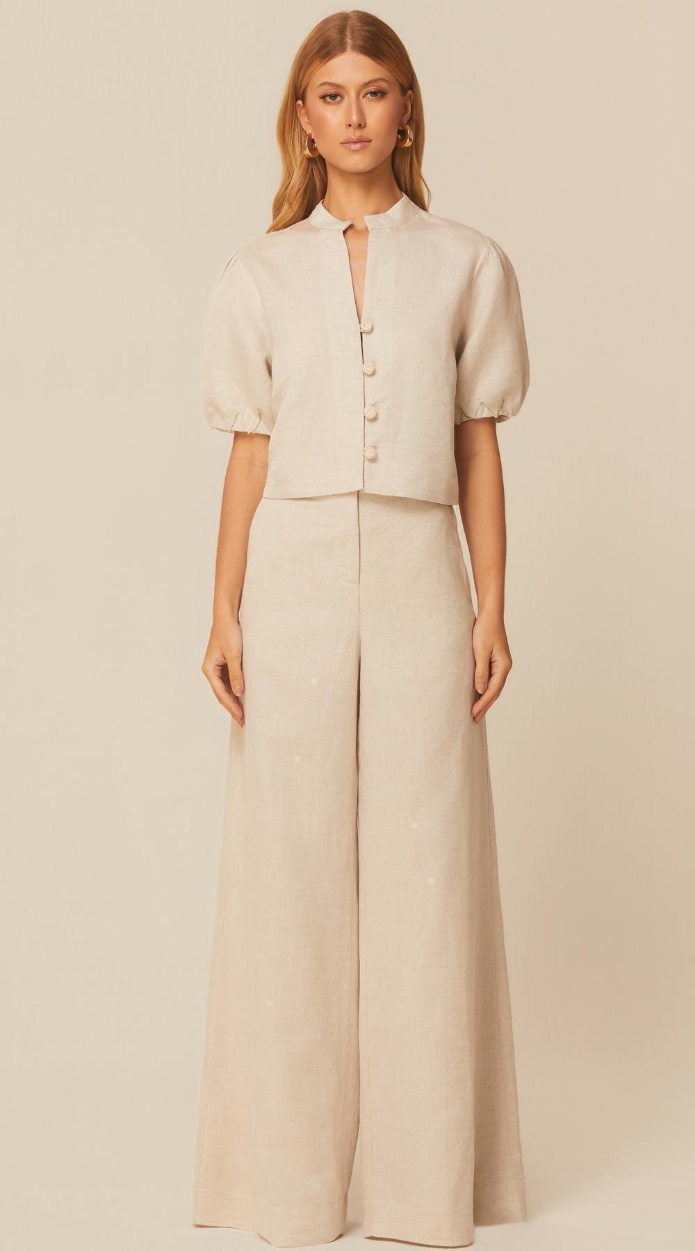Blusa cropped em viscolinho, com mangas curtas levemente bufantes e abotoamento frontal com botões de crochê. A textura natural e o design minimalista revelam um charme sutil e contemporâneo, ideal para composições leves e elegantes.
