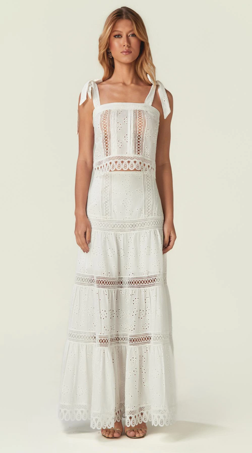 Saia longa em laise que equilibra feminilidade e refinamento. Os recortes em renda percorrem a peça com delicadeza, criando transparências sutis e um visual leve. A estrutura alonga a silhueta, enquanto o zíper invisível assegura ajuste preciso e acabamento sofisticado.